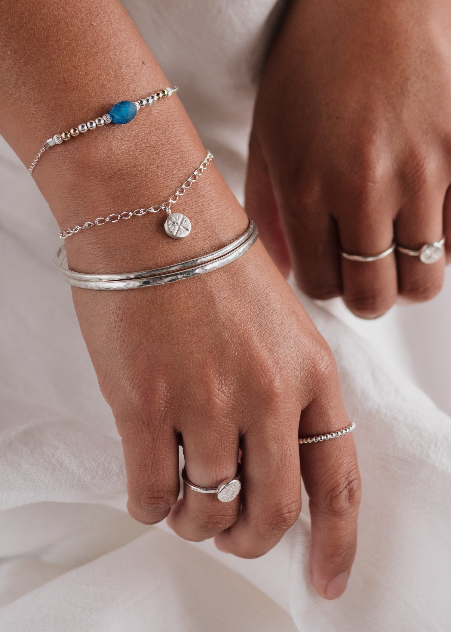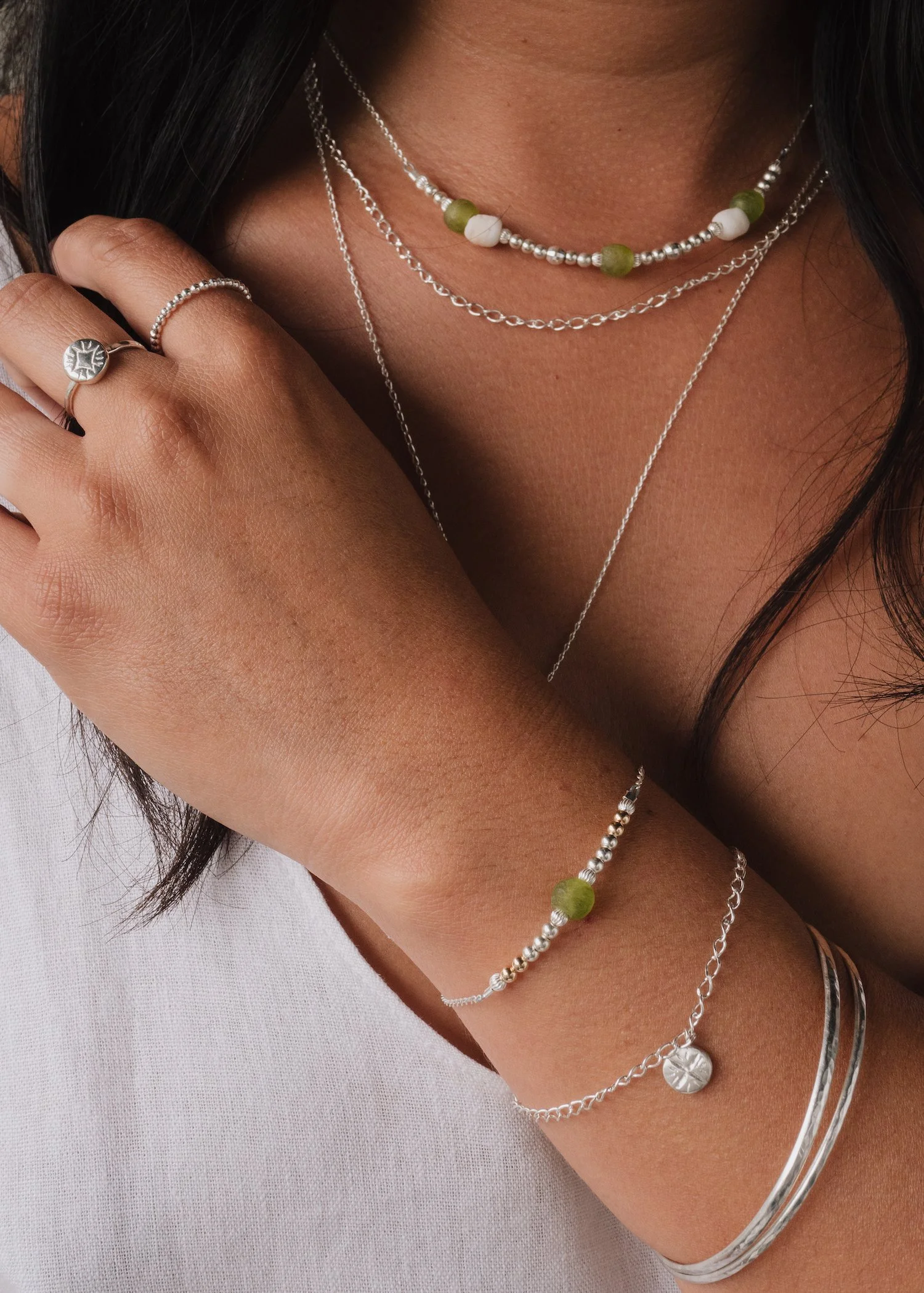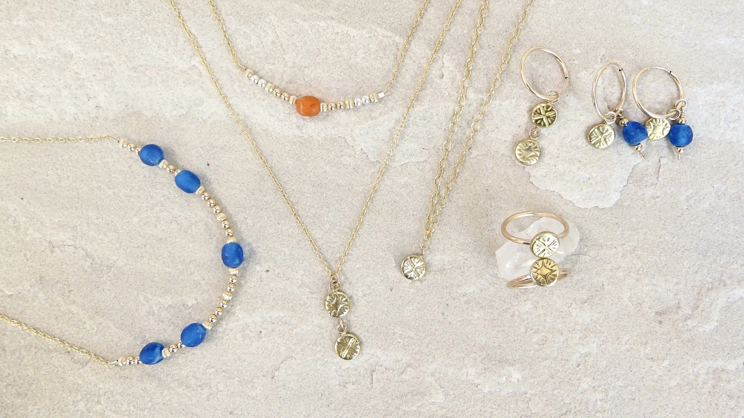 Emulating the colours of the ocean, the gorgeous orange of sunset and the fresh lime green of a rainforest, our new beaded bracelets and necklaces feature recycled glass beads handmade by the Krobo people of Ghana. The glass beads are made by crushing glass to a fine powder and heating it so that the particles fuse together. The glass is then poured into clay moulds with a cassava leaf stem to make the hole. They are baked in an oven and the glass fuses and the cassava stem burns up. This technique has been used in Africa for centuries. Our hand carved star designs on brass and Sterling Silver complement the beads perfectly while also shining on their own. Perfect for everyday wear, our stardust collection allows the starry universe to sparkle on your skin all day long.